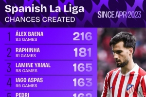 体育资讯4月2日讯 Squawka统计了亚马尔2023年4月西甲首秀以来,球员在西甲创造机会的次数,并列出榜单,亚马尔创造165次机会,仅少于巴埃纳、拉菲尼亚。