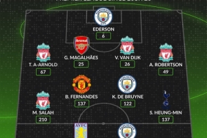 后卫:阿诺德(利物浦,67球)、加布里埃尔(阿森纳,25球)、范戴克(利物浦,26球)、罗伯逊(利物浦,49球)