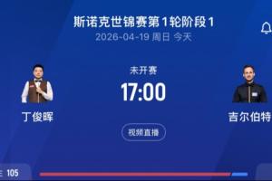 丁俊晖首轮对阵大卫·吉尔伯特,两个阶段分别在4月19日17:00和4月20日17:00。