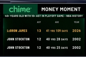 转播方晒出统计,詹姆斯今日13次助攻刷新了历史上40岁球员季后赛单场助攻纪录,此前是斯托克顿的12次。