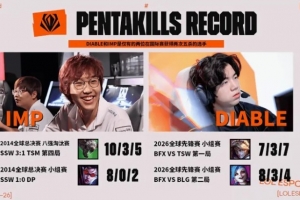 体育资讯3月20日讯 在本次全球先锋赛中,Diable连续两个BO5拿下五杀,分别是BFX对阵BLG第二局的金克斯,以及BFX对阵TSW第一局的伊泽瑞尔;