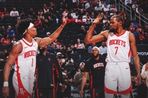 赛后火箭官推发布赢球海报,封面是阿门和杜兰特击掌瞬间。