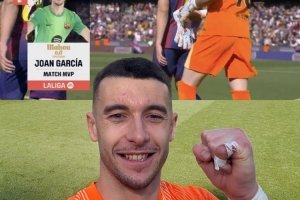 体育资讯3月22日讯 西甲第29轮比赛,巴萨在诺坎普以1-0的比分小胜巴列卡诺。本场比赛,红蓝军团门将霍安·加西亚表现出色,赛后被评为全场最佳球员。