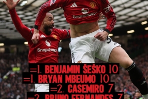 曼联官推晒出了舍什科、姆伯莫、卡塞米罗、B费以及库尼亚等5人的进球数,并发问:谁将赢得队内射手王之争?目前,舍什科和姆伯莫以10球并列榜首,卡塞米罗、B费和库尼亚均打进7球。